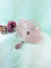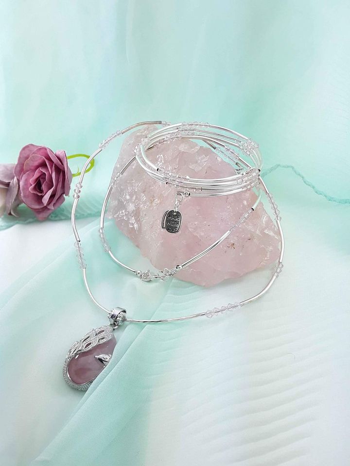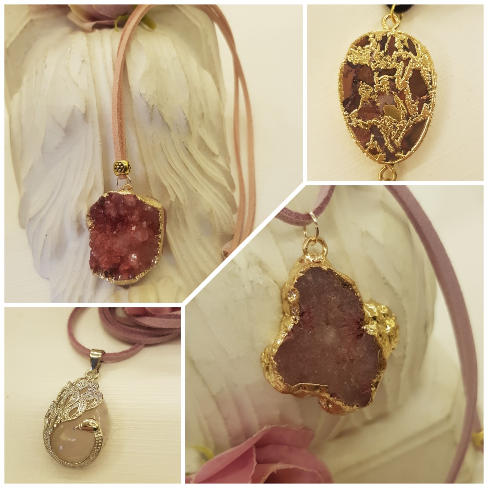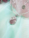 Rosakvarts i påfugleindfatning sat i halskæde med små rosafarvede