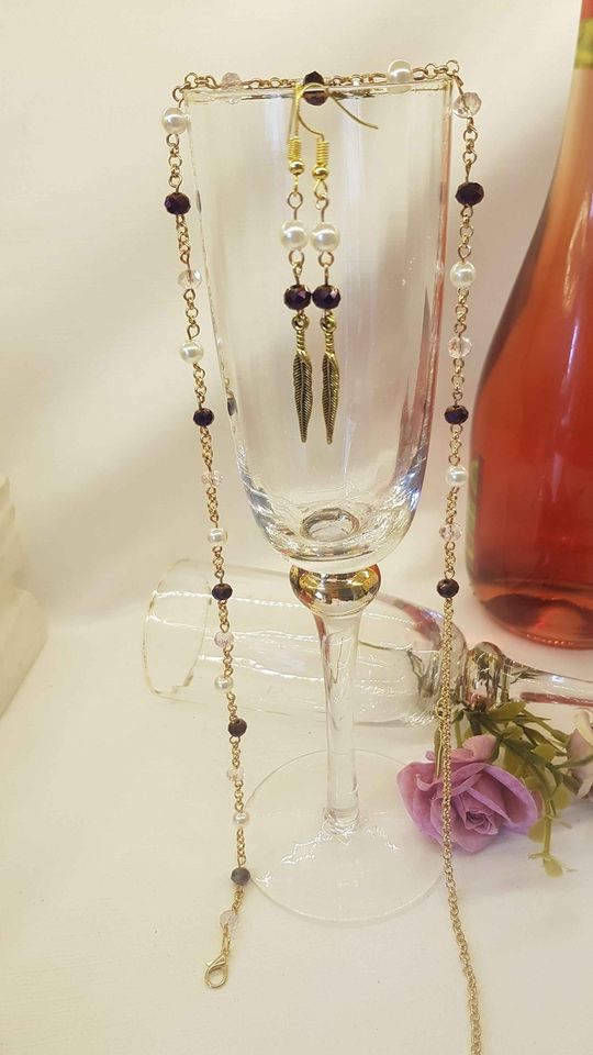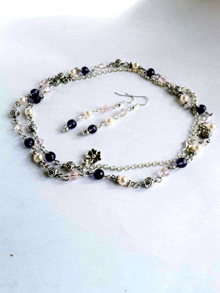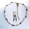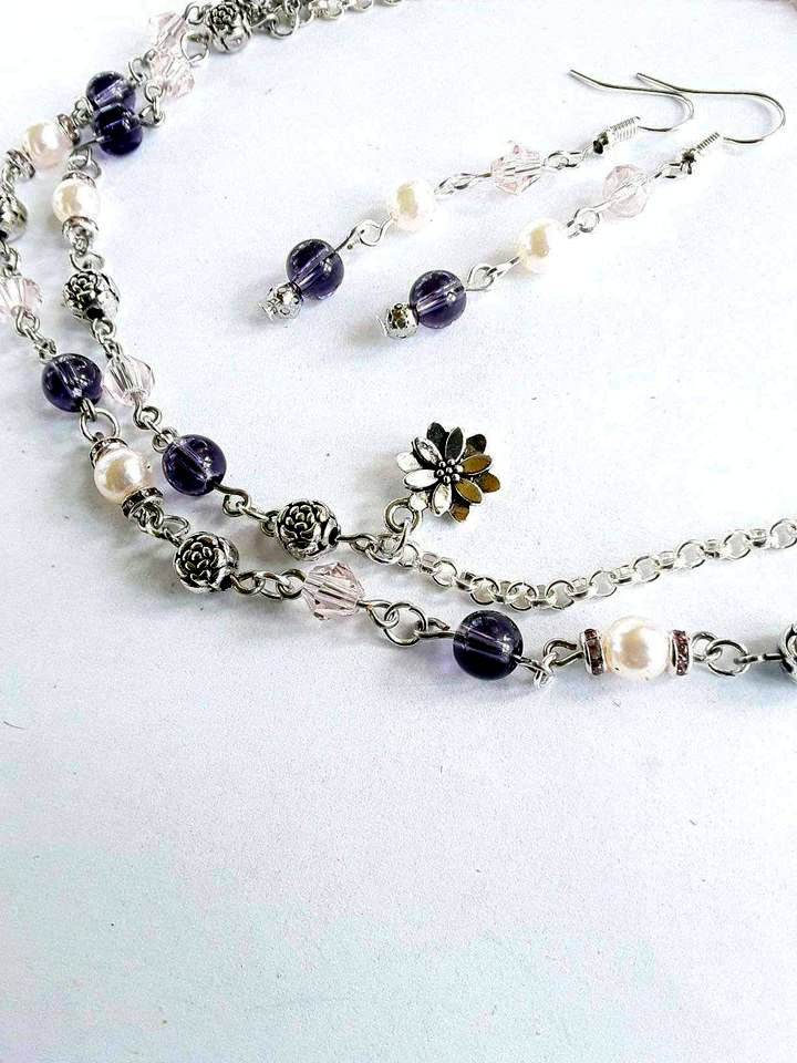 Halskæde med tilhørende øresmykker med ametyst farvede sten.
